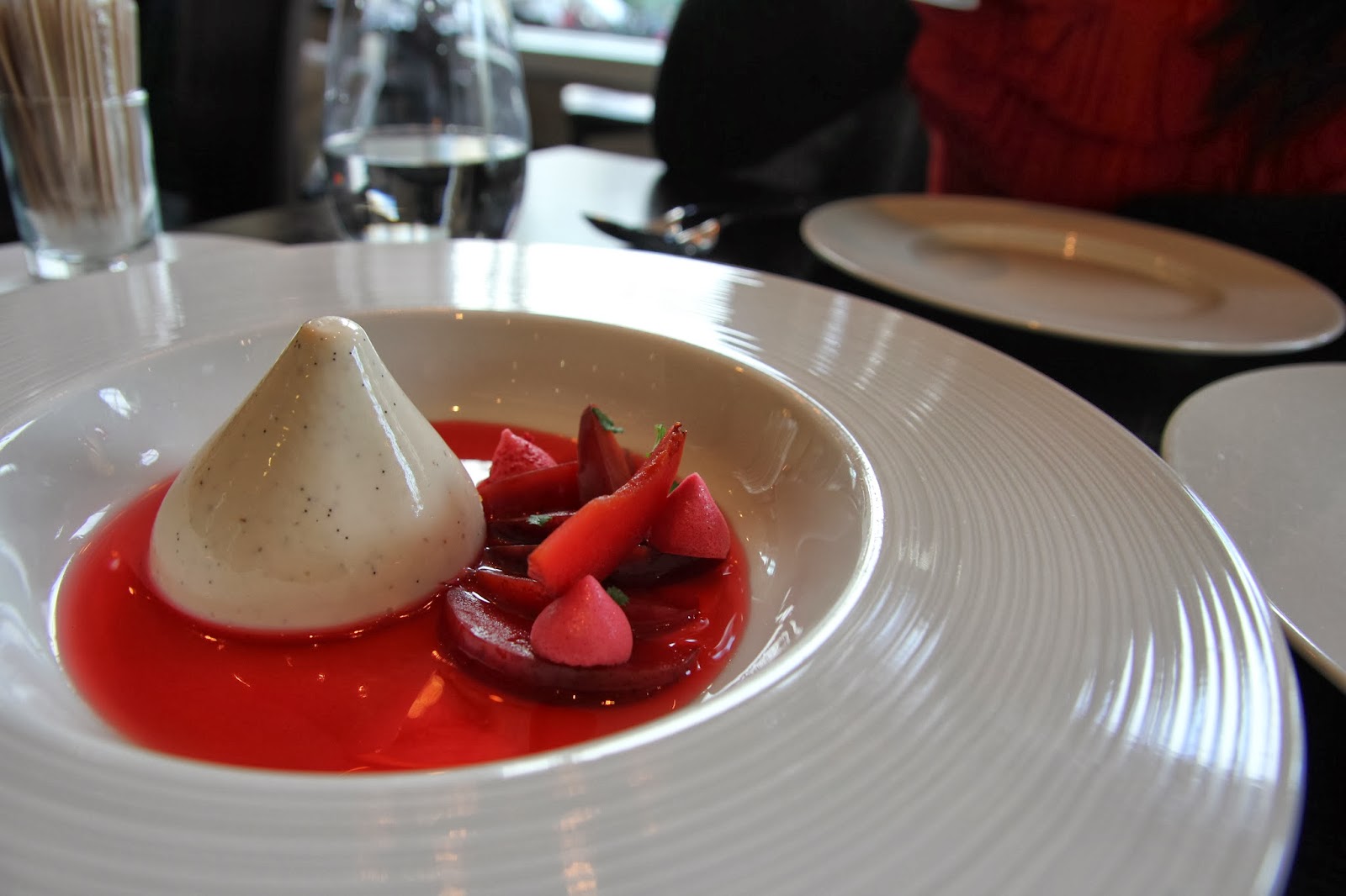 Despite having shared a starter and wolfing down a further two courses, we were eager to see what dessert had in store for us. The wobbly tear drop steeple cream was silky and delightfully infused with vanilla. The poached plums that accompanied the cream were firm and tart in contrast and the syrup if nothing else, completed the dish with its candy pink appeal.