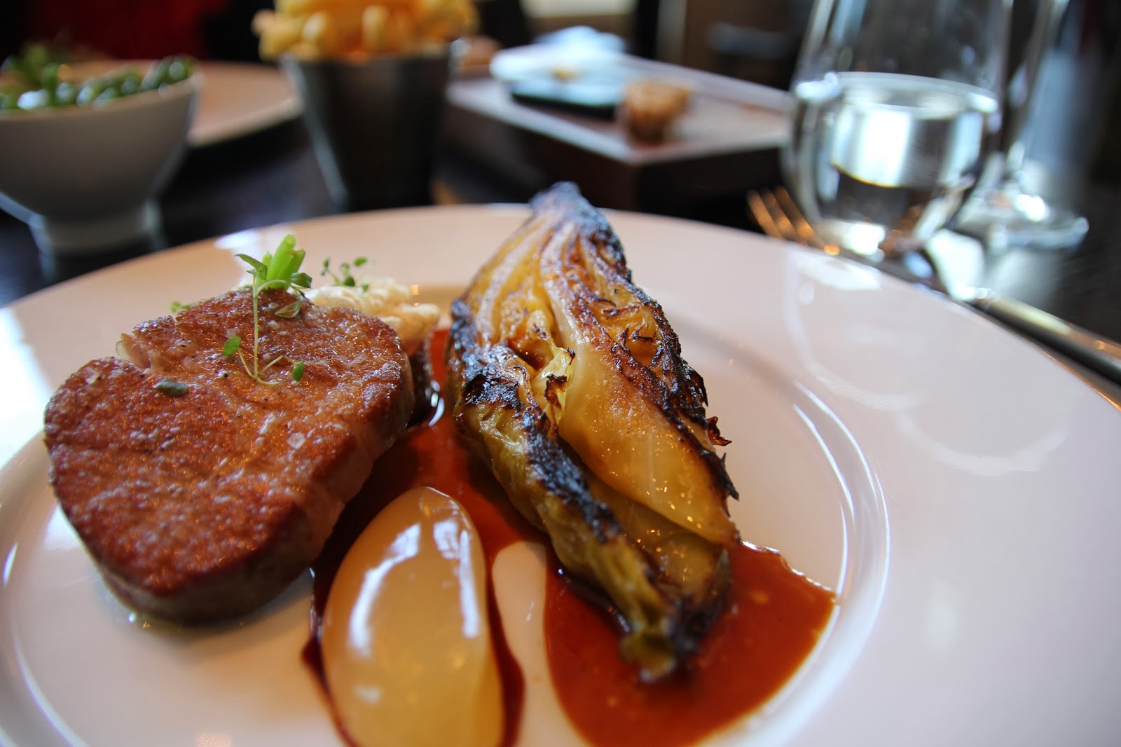 We had green beans and shallots and fries as sides. The green beans were incredibly thin, buttery and cooked until very tender. The fries were a bit thick for my liking and were good but didn’t blow me away.